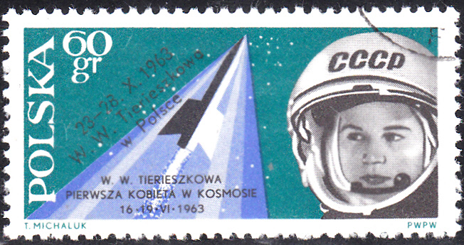 Die zweite Marke der Serie (MiNr 1416) zeigt Walentina Tereschkowa und Wostok. Hier zeige ich nur die motivgleiche Marke zum Besuch der Kosmonauten W. Tereschkowa und W. Bykowskij in Polen mit Bdr.-Aufdruck "23-28. X. 1963 / W. W. Tierieszkowa / w Polsce" (MiNr 1435).