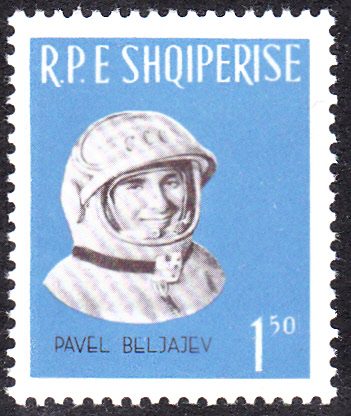 In Albanien ist zum Flug von Woschod 2 eine Serie von vier Marken erschienen. Hier die erst der Marken (MiNr 941) mit einer Abbildung von Pawel Beljajew (1925-1970).