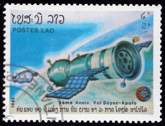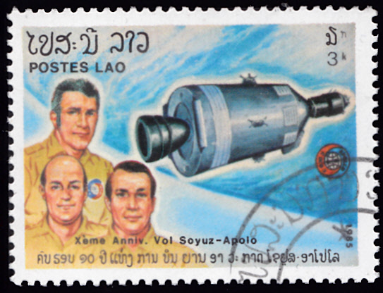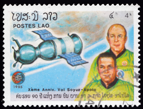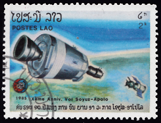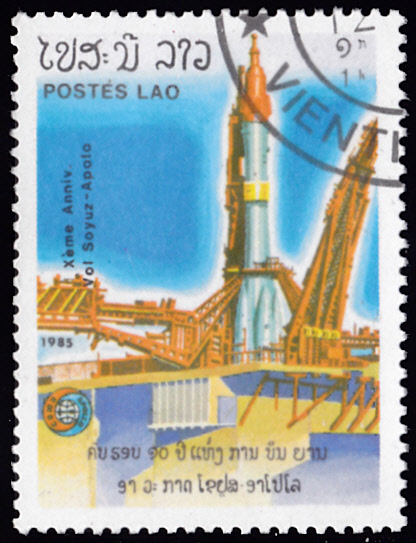 Zum 10. Jahrestag des gemeinsamen Apollo-Sojus-Raumfluges ist in Laos in einer Serie diese Marke (MiNr 852) mit einer sowjetischen Rakete an de Startrampe erschienen.
