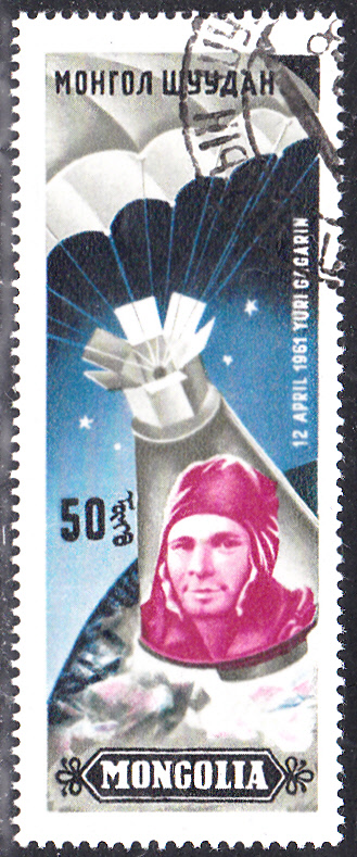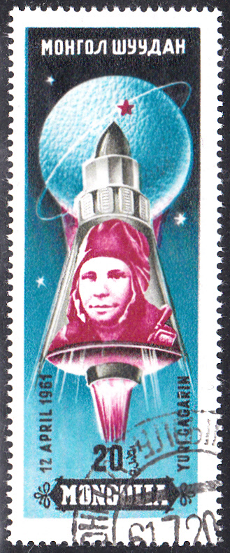 Zum 1. bemannter Raumflug durch Juri Gagarin erschien in der Mongolei in einer Serie diese Marke (MiNr 221) mit Gagarin in einer Raumkabine vor der Weltkugel mit einer Satellitenbahn.