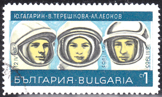 Es folgt eine Marke aus Bulgarien (MiNr 1758), die die Kosmonauten Juri A. Gagarin (Wostok 1, 12.4.1961), Valentina V. Tereschkowa (Wostok 6, 26.6.1963) und A. Leonow (Woschod 2, 18.3.1965) zeigt.