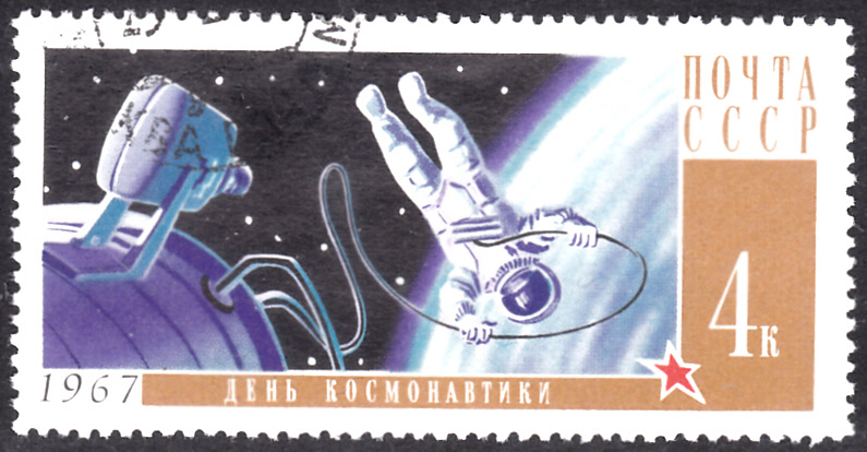 Auf dieser Marke zum Tag der Kosmonauten 1967 (MiNr 3336) sehen wir Aleksej Leonow bei seinem Weltraumspaziergang.