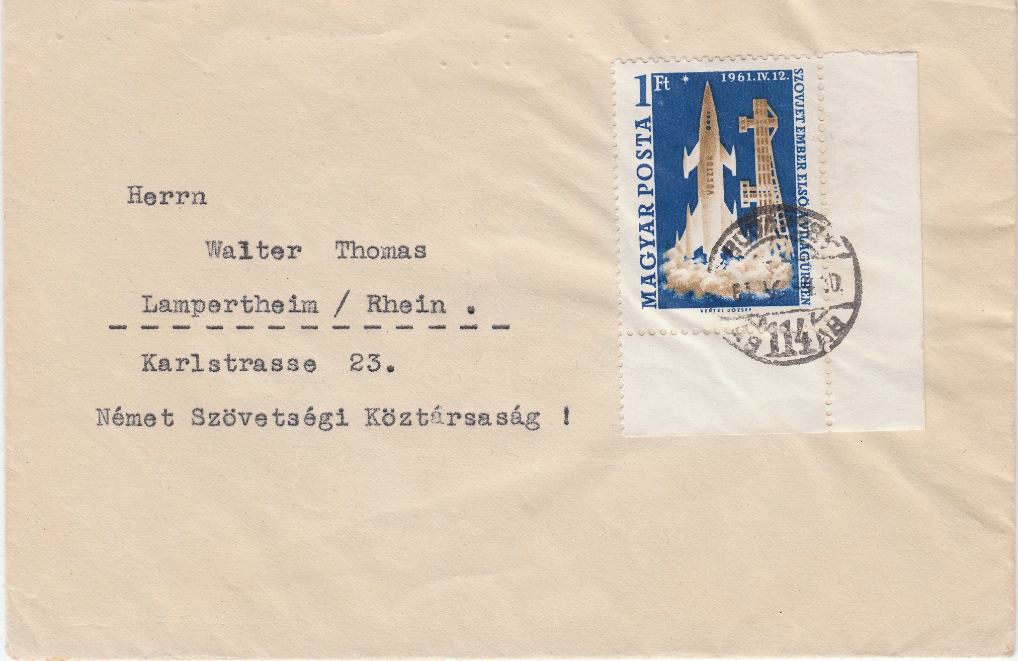Hier eine Sondermarke aus Ungarn zu diesem Anlaß, verwendet in Form eines Eckrand 4 als EF auf einem Brief nach Deutschland: