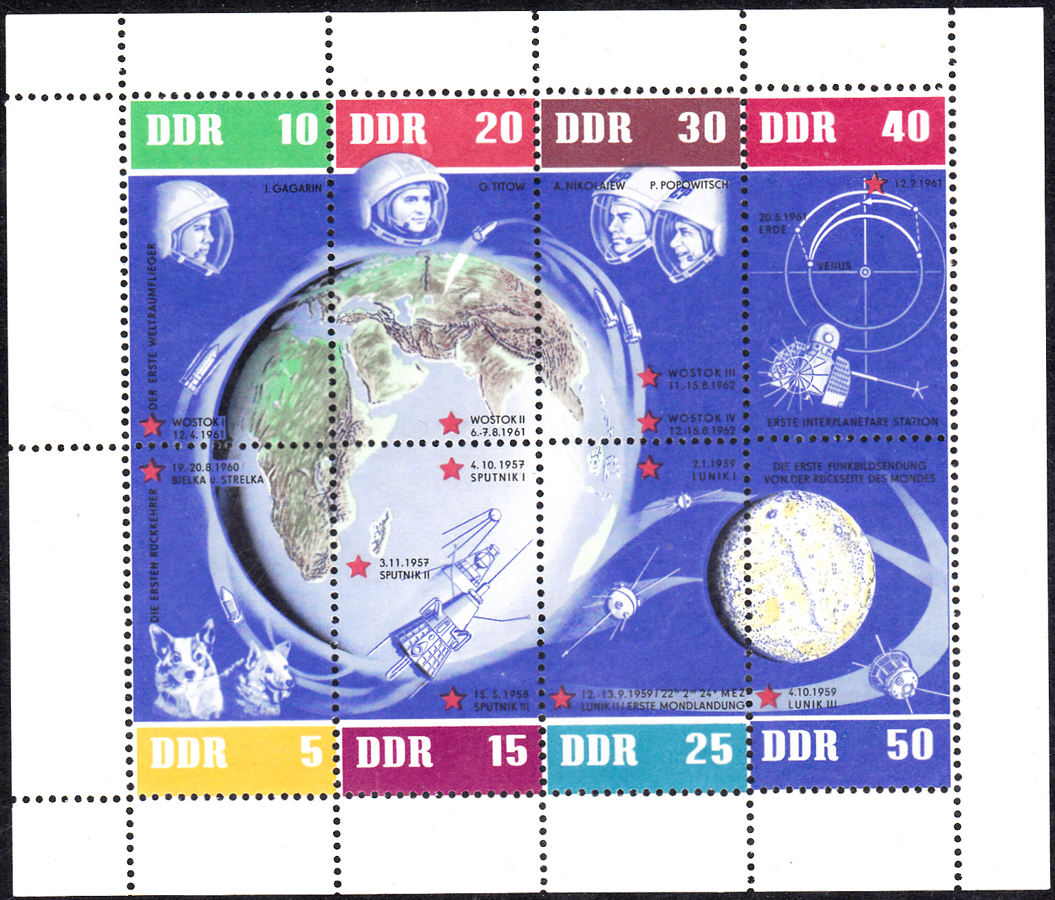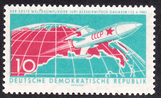 Wie man erkennt hatte der Künstler wohl keine Originalabbildung der Rakete Wostok zur Hand und dachte sich aus, wie diese Trägerrakete wohl ausgesehen haben könnte!