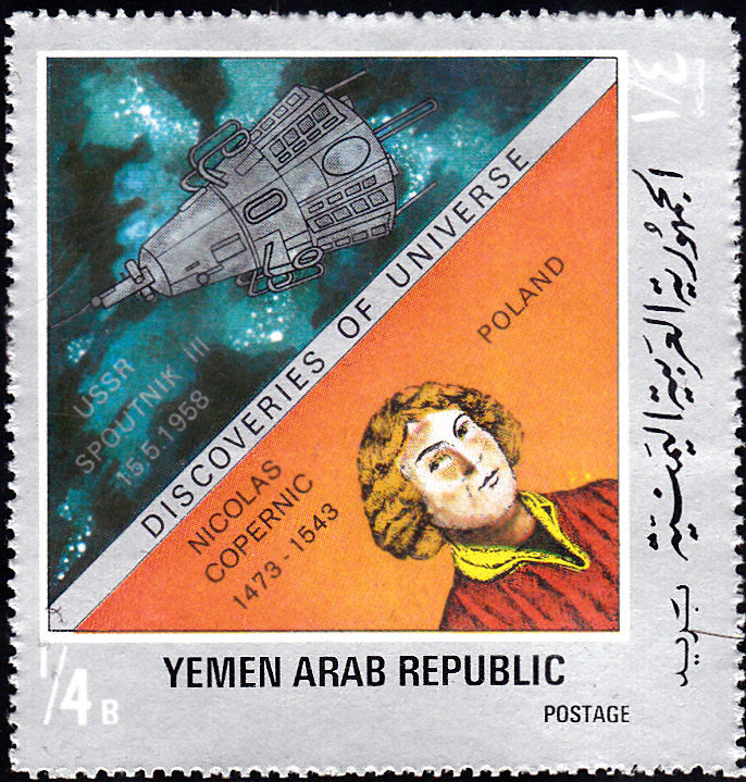 Diese Marke aus Jemen-Nord (MiNr 904) zeigt oben Sputnik 3 und unten den Astronomen Nikolaus Kopernikus (Polen).