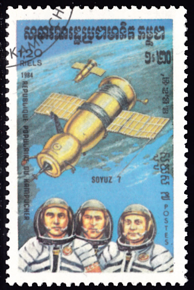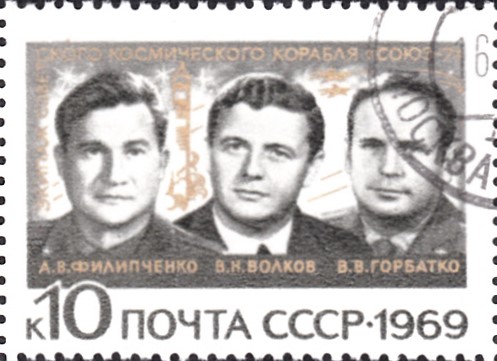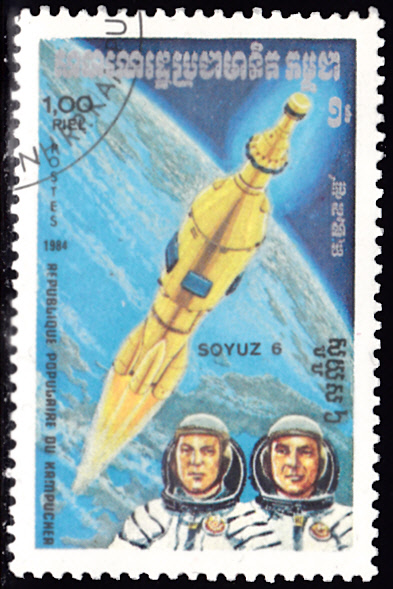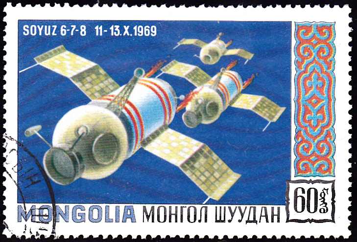 Diese Marke aus der Ausgabe der DDR zum Jubiläum "10 Jahre bemannte sowjetische Weltraumflüge" zeigte auf der rechten Seite der Marke den Staffelflug von Sojus 6,7 und 8.