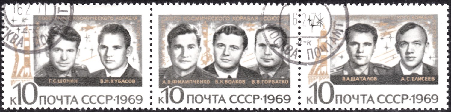 Sojus 6 startete am 11. Oktober 1969 mit Georgi Stepanowitsch Schonin, (Kommandant) und Waleri Nikolajewitsch Kubassow (Bordingenieur) von Rampe 31 in Baikonur. Sojus 7 startete am 12. Oktober 1969, einen Tag nach Sojus 6, aber von einer anderen Startrampe in Baikonur. An Bord waren: Anatoli Wassiljewitsch Filiptschenko (Kommandant), Wladislaw Nikolajewitsch Wolkow (Bordingenieur) und Wiktor Wassiljewitsch Gorbatko (Bordingenieur). Am 13. Oktober 1969 fogte Sojus 8 mit der Besatzung Wladimir Alexandrowitsch Schatalow (Kommandant) und Alexej Stanislawowitsch Jelissejew (Bordingenieur). Damit waren erstmals drei Raumschiffe und sieben Raumfahrer gleichzeitig im Weltraum. Sojus 6 landete am 16. Oktober, an den beiden folgenden Tagen folgten Sojus 7 und Sojus 8.