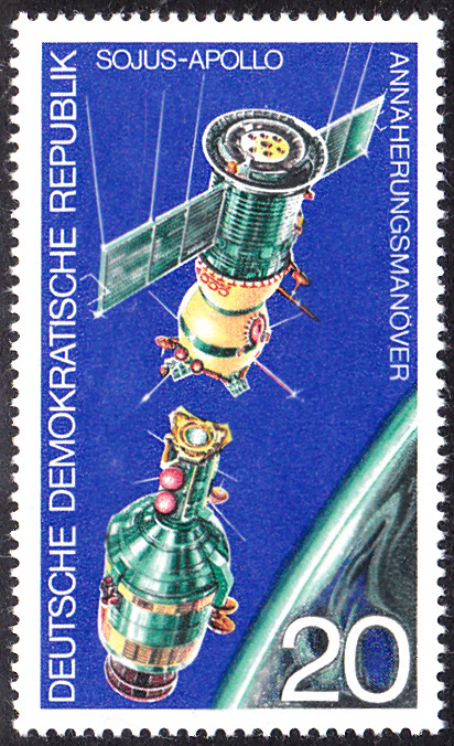 In der DDR ist zu dem Sowjetisch-amerikanisches Raumfahrtunternehmen Sojus-Apollo in einer Serie diese Marke (MiNr 2083) erschienen, die den Start des Sojus-Raumschiffes zeigt.