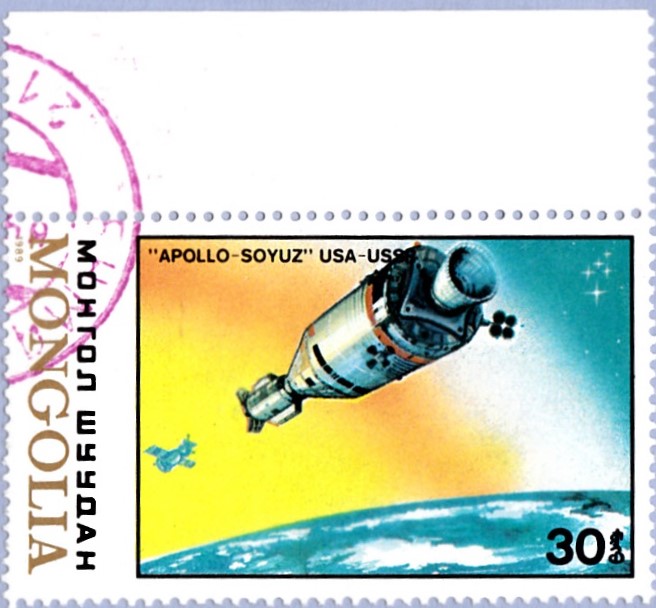 Auch die Mongolei hat eine Marke zum Sojus 19/Apollo-Sojus-Test-Projekt (ASTP) mit den beiden Raumschiffen Sojus 19 und Apollo kurz vor der Koppelung.