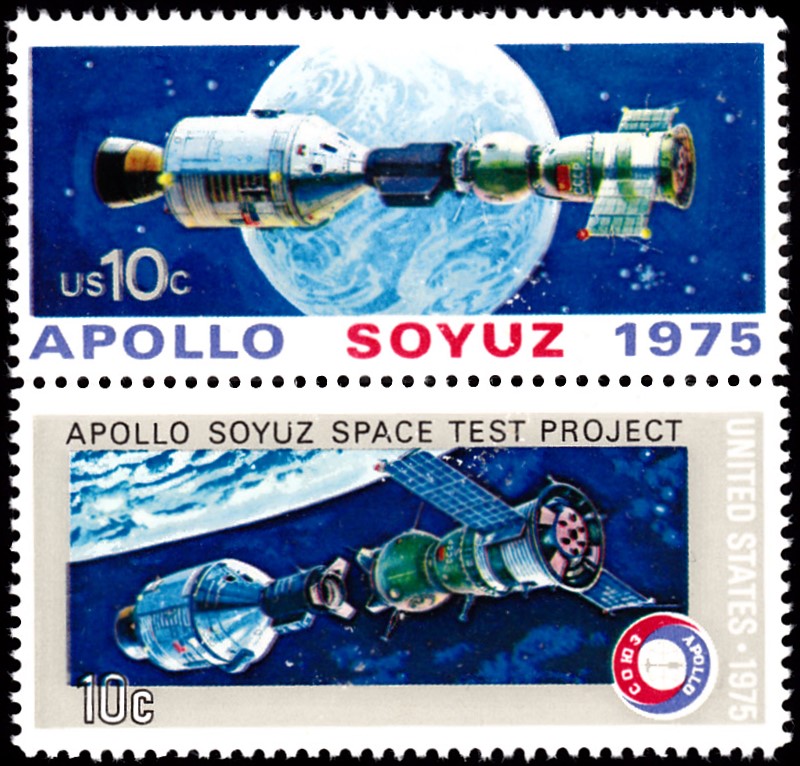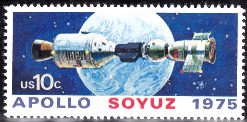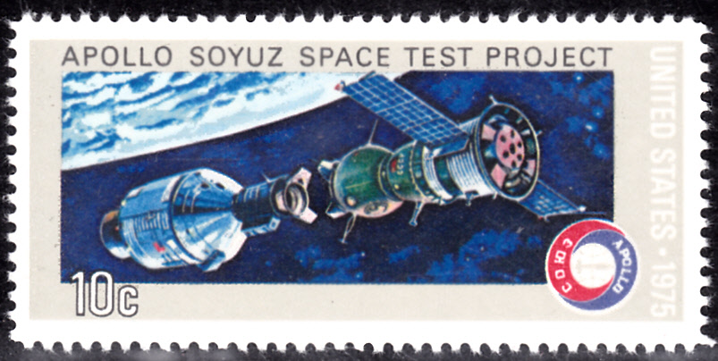 In den USA sind zu dem Sowjetisch-amerikanisches Raumfahrtunternehmen Sojus-Apollo ebenfalls marken erschienen. Hier kommt eine der beiden Marken (MiNr 1179), die Apollo und Sojus 19 gekoppelt vor Erdkugel zeigt.