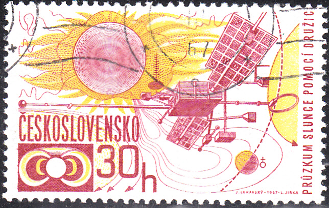 Auf dieser Marke aus der Tschechoslowakei (MiNr 1688) sehen wir einen OGO-Erdsatelliten vor Solarfeldern und einen Erdbahnabschnitt.