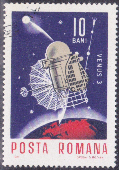 Auf dieser Marke aus Jugoslawien (MiNr 1219) werden die Marssonde "Mariner 4" und Venussonde "Venus 3" (unten) gezeigt.