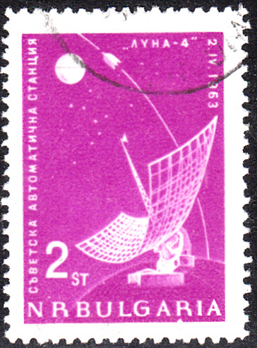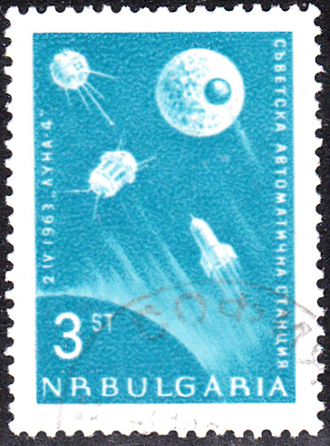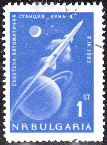 In Bulgarien erschien 1963 eine Freimarkenserie "Mondsonde". AUf den Marken wird das Startdatum von Luna 4, der 2.4.1963" angegeben. Hier die Marke zu 1 Stotinki (MiNr 1388) bildet eine Zweistufige Phantasie-Rakete ab, die die Erde umkreist.