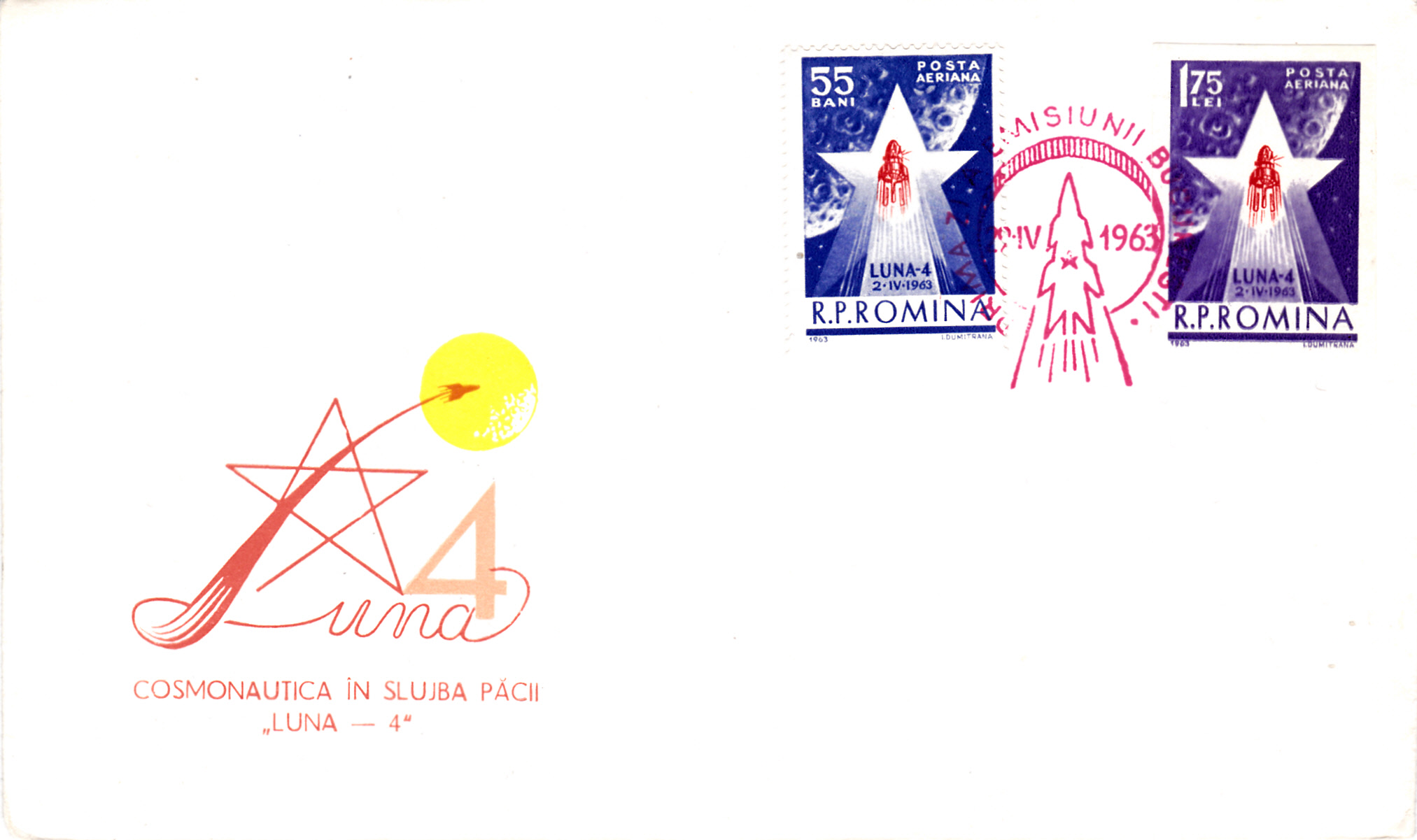 Auf diesem FDC wurden die beiden bildgleichen Marken zum Start von "Luna 4"aus Rumänien mit dem Ersttagsonderstempel entwertet.