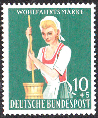 Auf dieser Marke aus dem Wohlfahrtsmarkensatz 1957 (MiNr 299) ist eine Sennerin mit ihrem Butterfass bei der Herstellung von Butter abgebildet.
