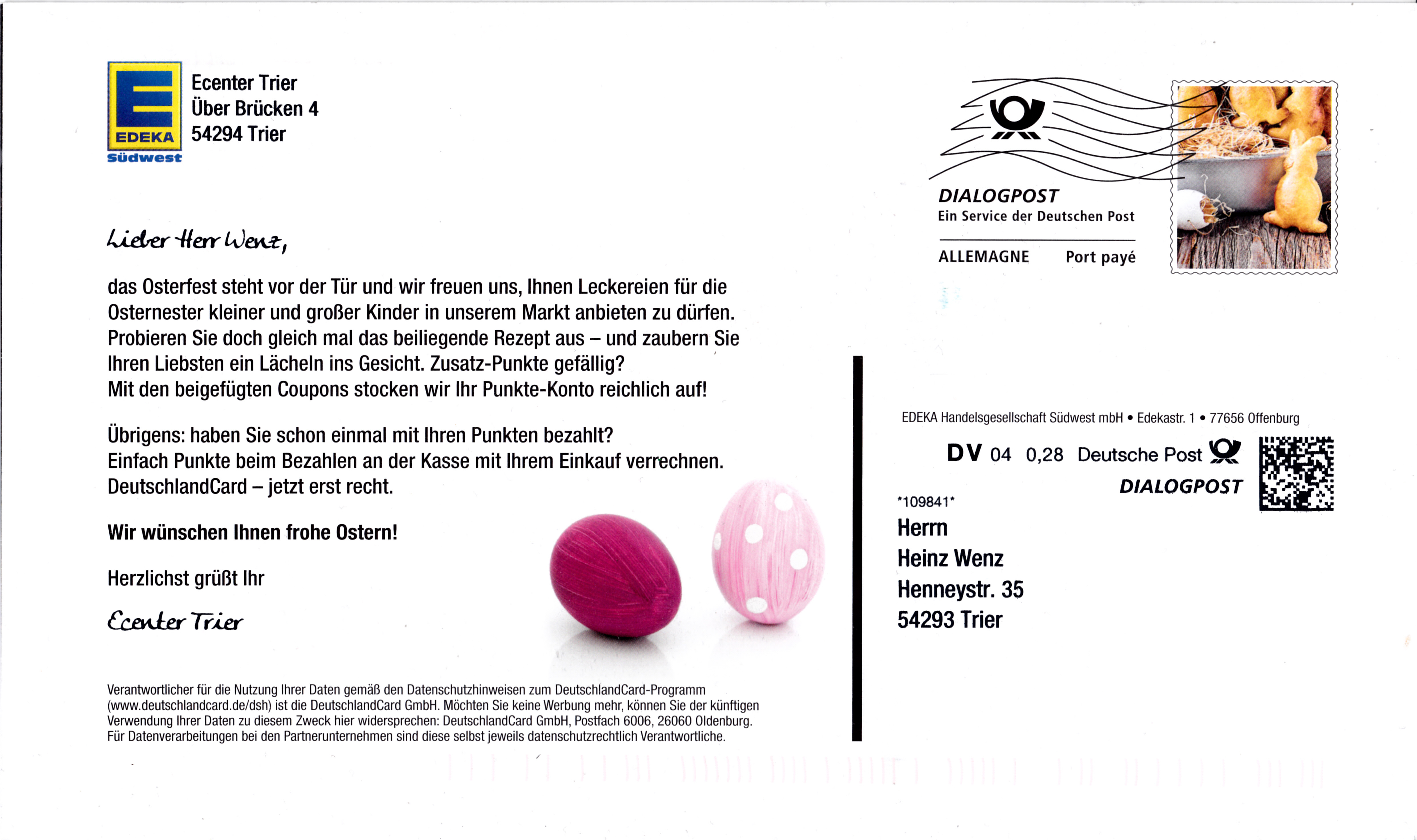 Dialogpost des Edeka-Center Trier mit einem Wertstempelähnlichen Zudruck mit dem Motiv "Osternest mit Osterhasen aus Hefeteig".