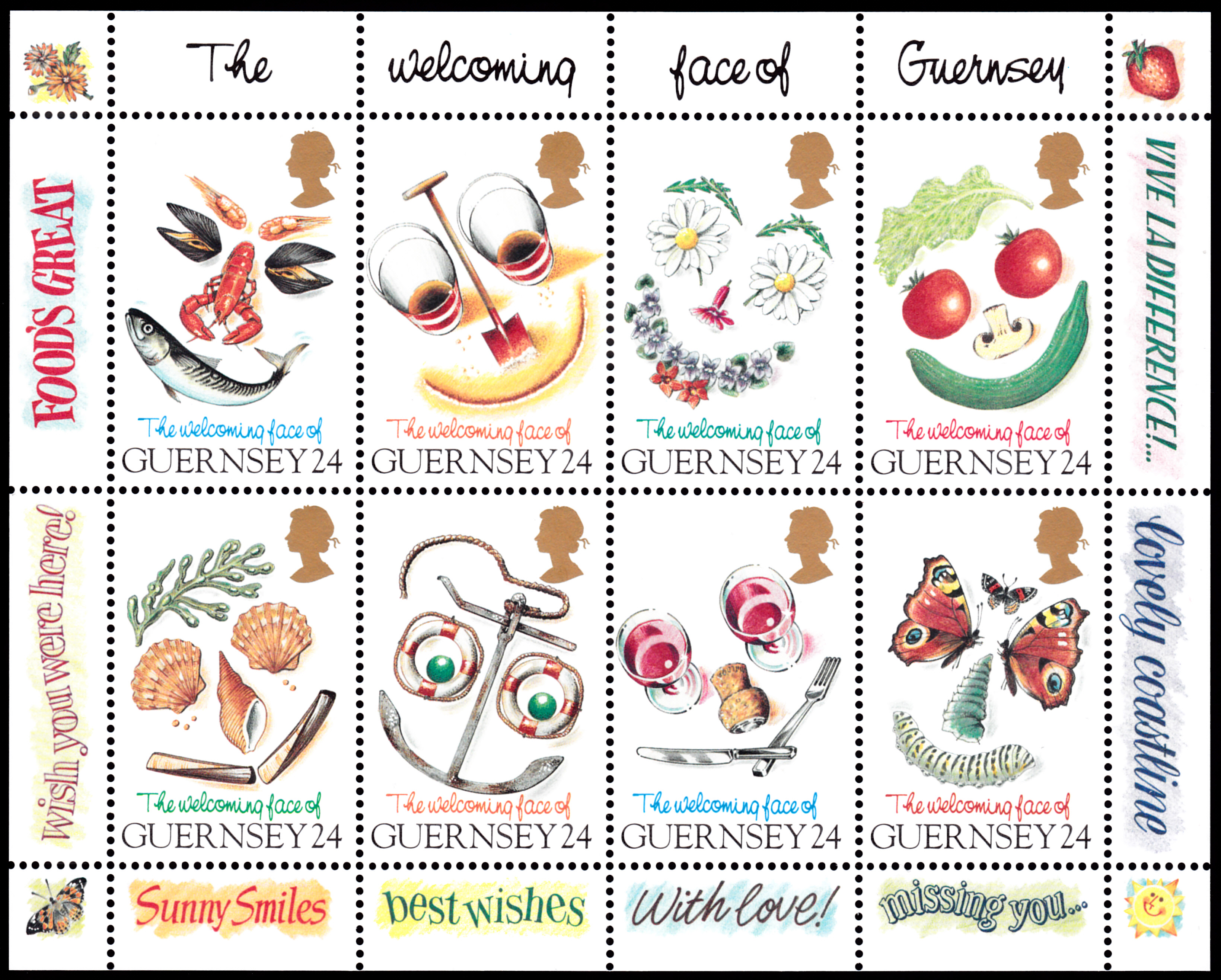 In einer Serie mit "Grußmarken: Lächelnde Gesichter aus landestypischen Produkten" ist auf Guernsey auch diese Marke (MiNr 668) erschienen, die unter anderem Messer und Gabel zeigt.