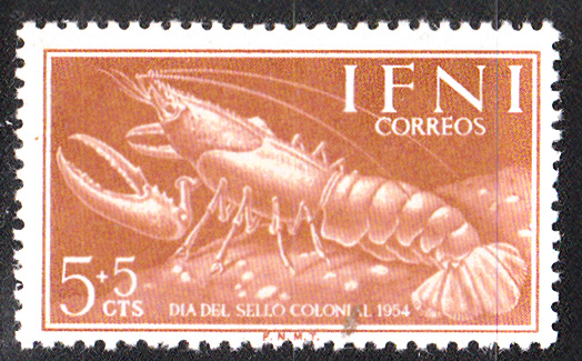 Auf dieser Marke aus der spanischen Kolonie Ifni (MiNr 147) bildet einen Hummer im Markenbild ab.