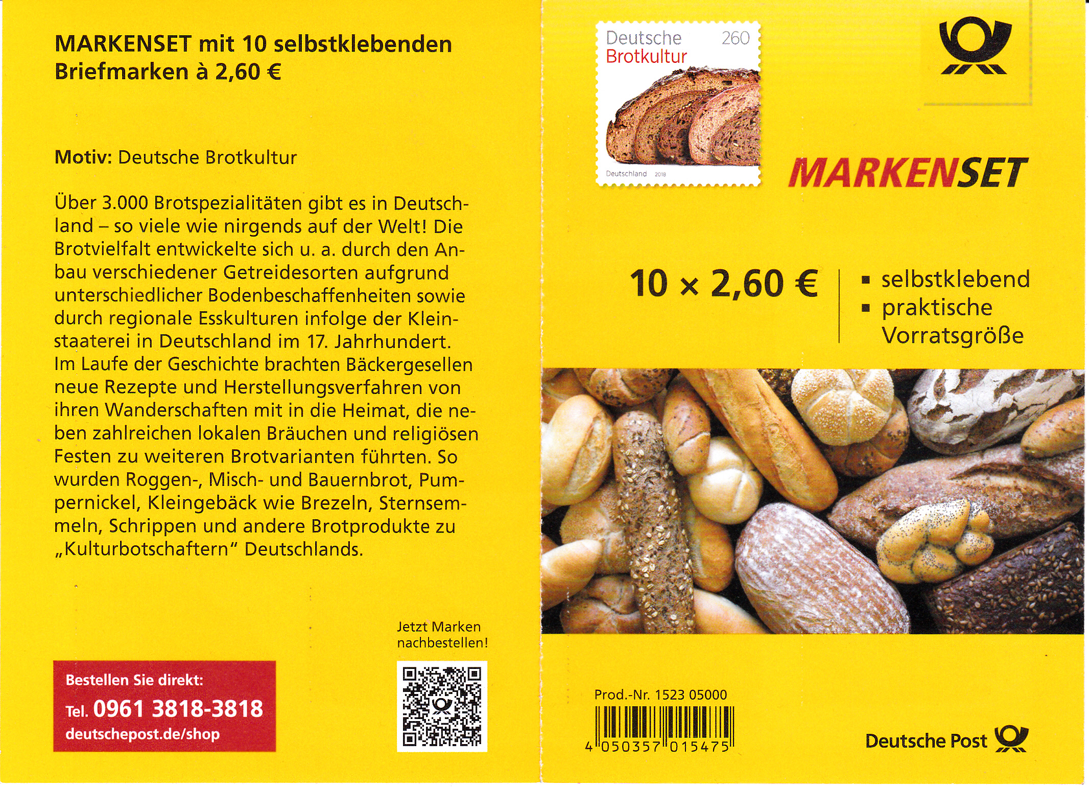 Die Marke "Deutsche Brotkultur" erschien am 3.5.2018 auch als selbstklebende Marke (MiNr 3390) in einem Markenheftchen und in Folienstreifen aus der Rolle.