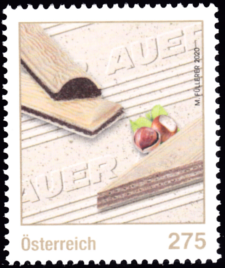 Zum Jubiläum "100 Jahre Süßwarenfabrik Auer in Attnang-Puchheim ist bei der österreichischen Post eine Marke (MiNr 3531) mit der Abbildung von "Waffelvariationen" der Firma Auer erschienen.