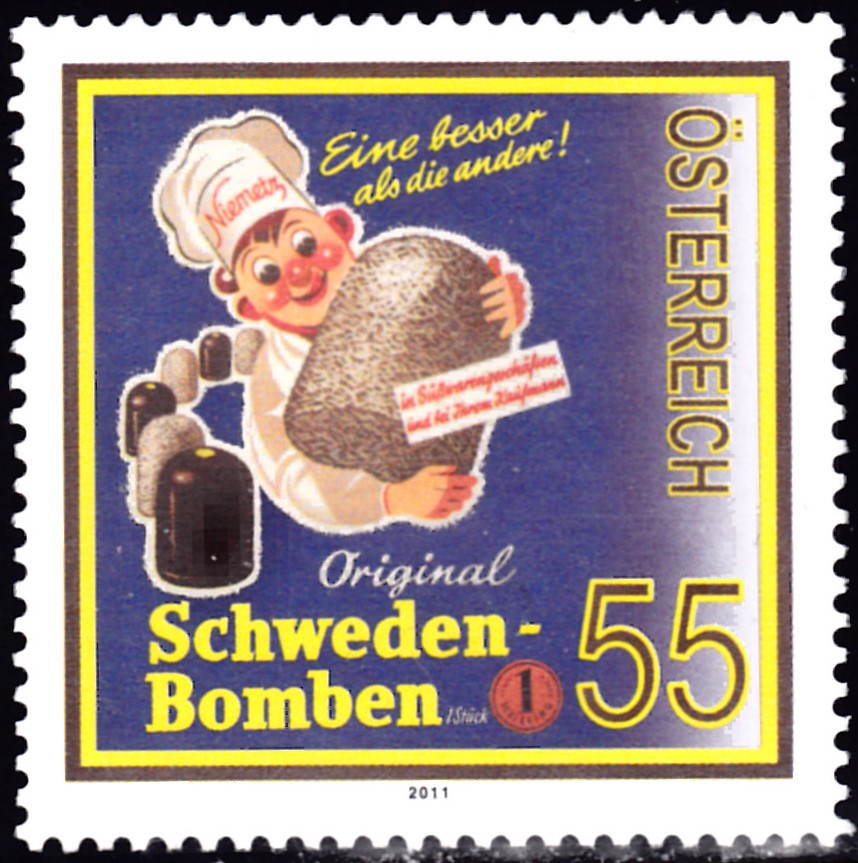 Aus Österreich kommt diese Marke aus der Serie "Klassische Warenzeichen" mit einem Werbeplakat für die "Schwedenbombe", einem Schaumkuss der Niemetz-Süßwarenmanufaktur in Wien (gegründet 1890).