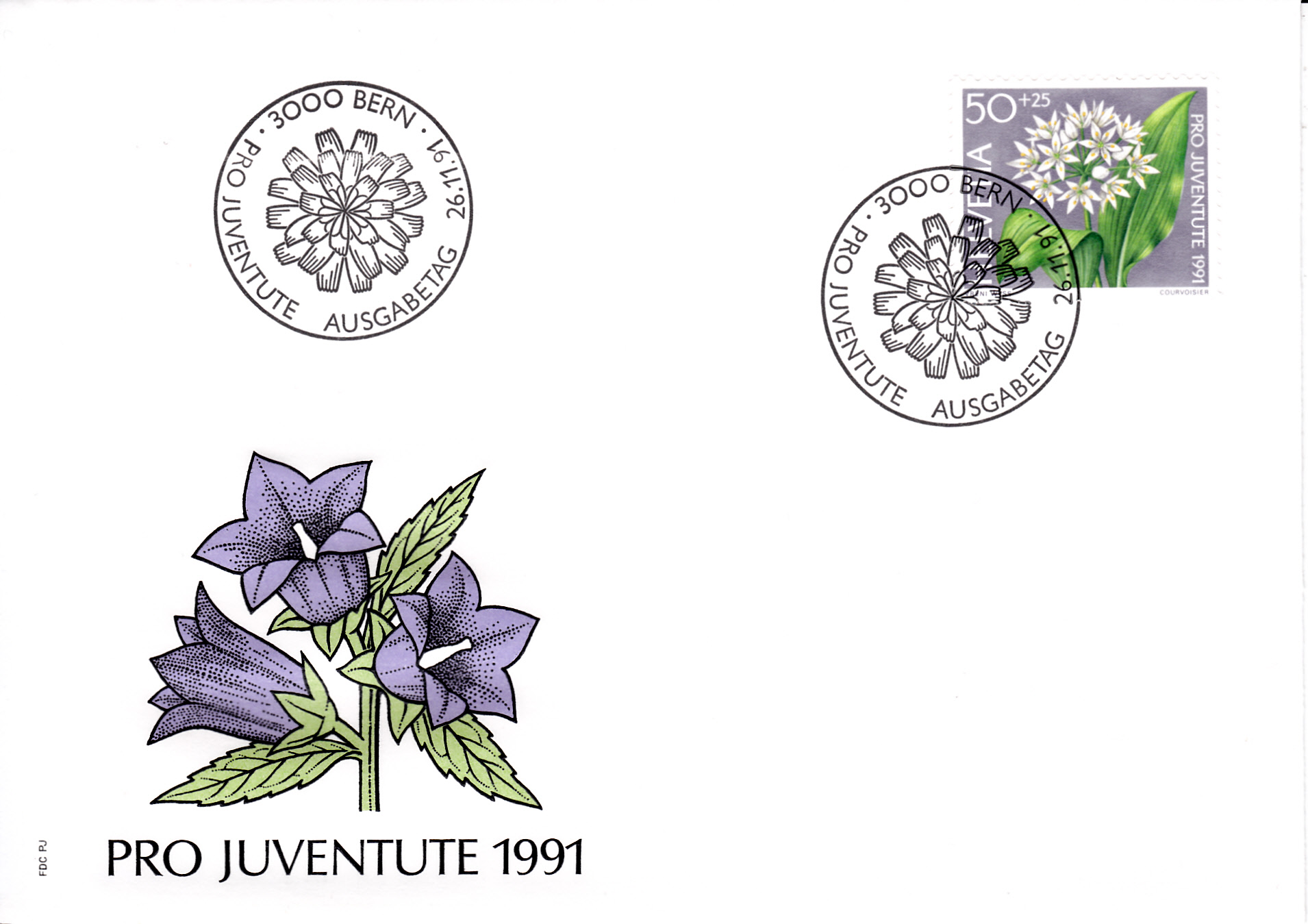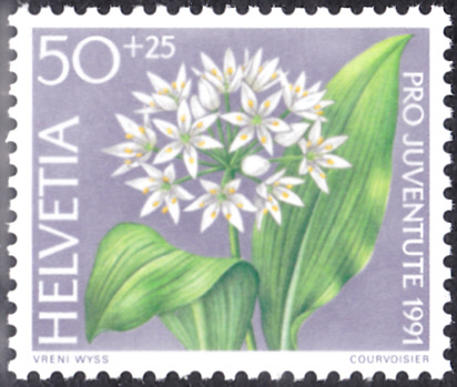 Auf einer Marke aus der Schweizer Serie "Pro Juventute" 1991 sehen wir blühenden Bärlauch (Allium ursinum).