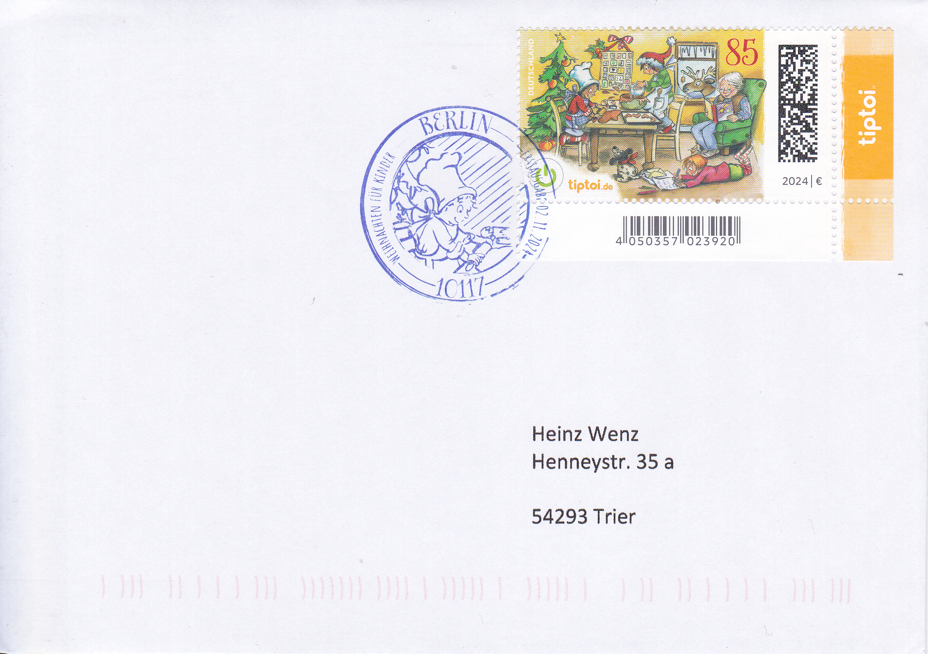 Brief vom Ersttag mit der nassklebenden Marke (MiNr 3865) "Weihnachtsbäckerei" und dem Ersttagsonderstempel Berlin.