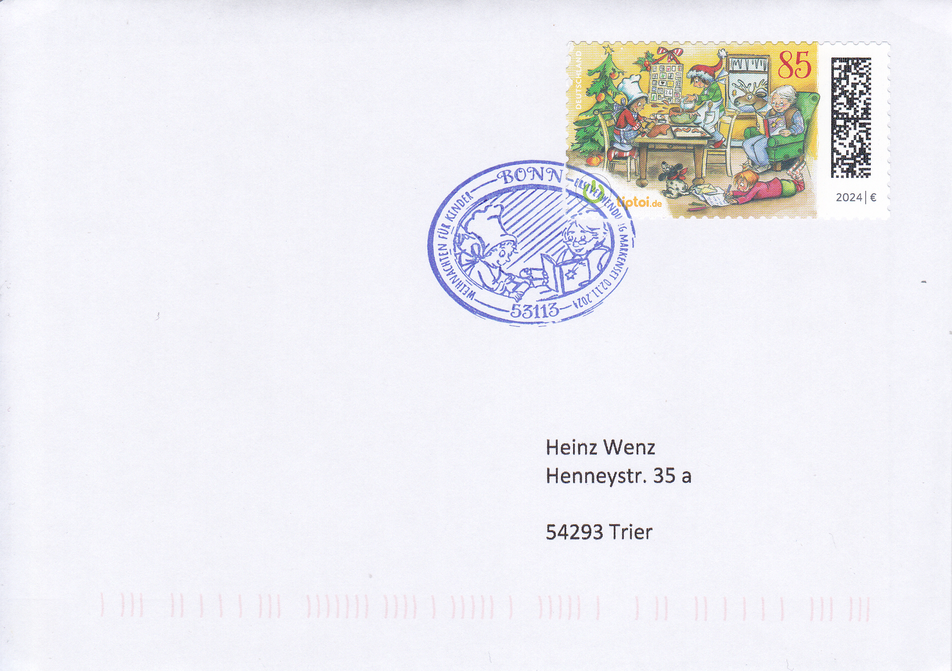 Brief vom Ersttag mit der nassklebenden Marke (MiNr 3865) "Weihnachtsbäckerei" und dem Ersttagsonderstempel Bonn.