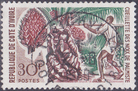In der Elfenbeinküste ist in einer Serie "Früchte des Landes" diese Marke (MiNr 313) Mit einer Abbildung zur Ölpalmfrucht-Ernte.