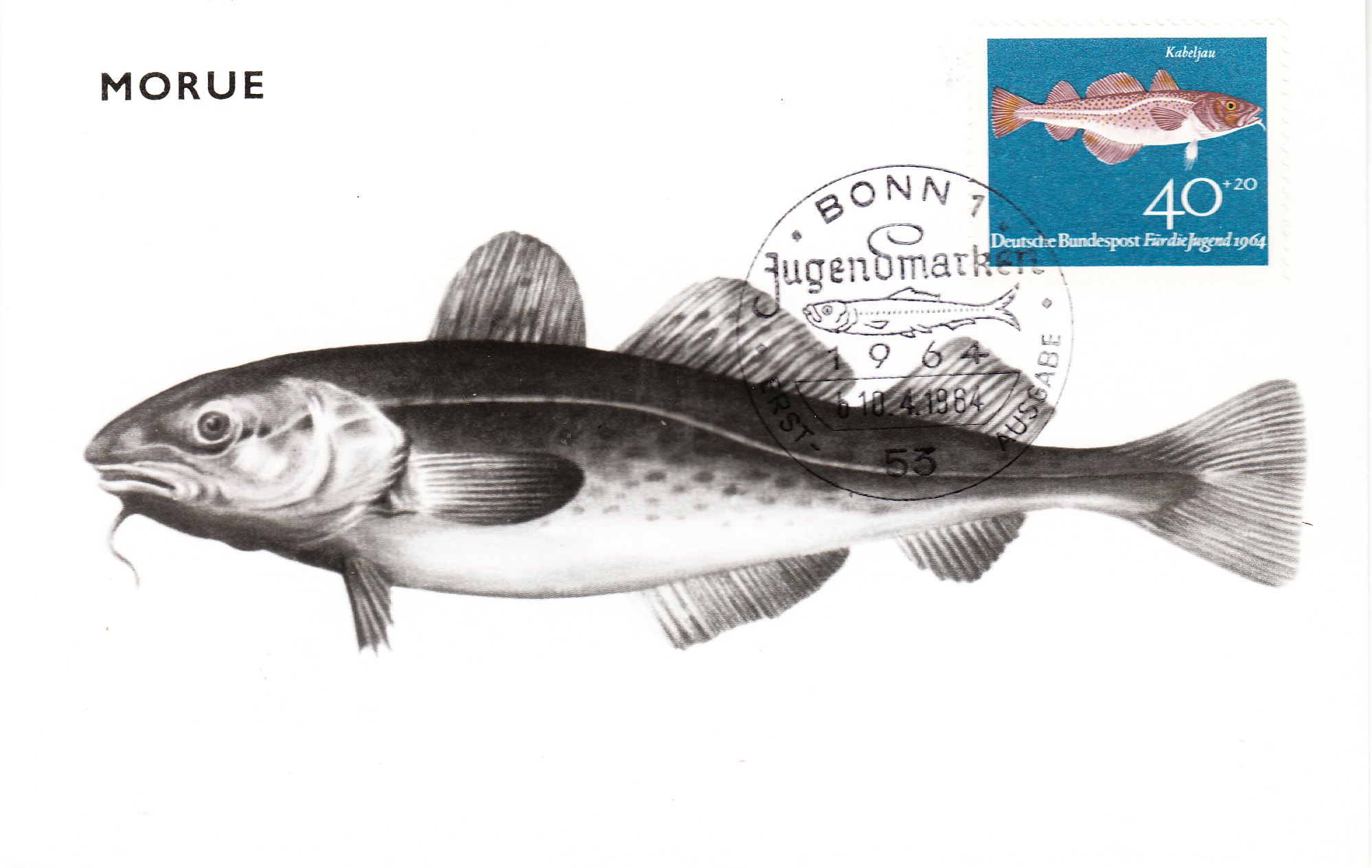 Der Höchstwert zu 40+20 Pfennig der Jugendmarken 1964 bietet uns als Motiv einen Kabeljau, hier auf einer Maximumkarte mit der französischen Bezeichnung "MORUE", entwertet per ESST: