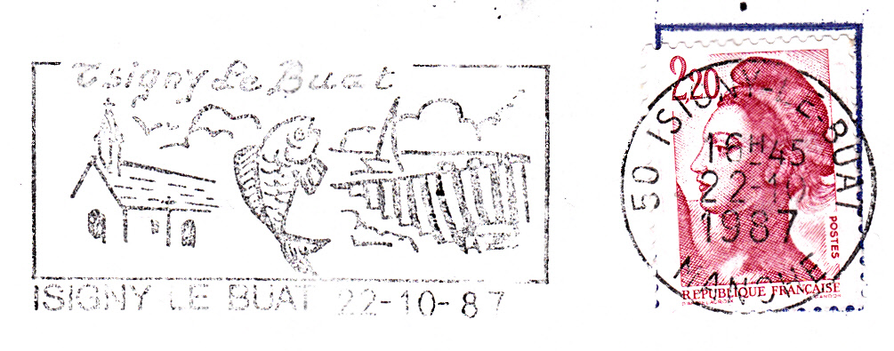Maschinenwerbestempel aus Isigny le Boat, einer französische Gemeinde mit 3321 im Département Manche in der Region Basse-Normandie, mit dem Bild eines Fisches, vielleicht als Hinweis, dass es sich lohnt im nahegelegenen Stausee zu fischen. Die Staumauer von Vezins ist ebenfalls abgebildet.