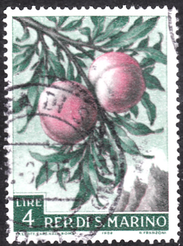 Auch auf dieser Marke aus San Marino (MiNr 597) ist ein Zweig eines Pfirsichbaumes (Prunus persica) mit zwei Früchten zu sehen.