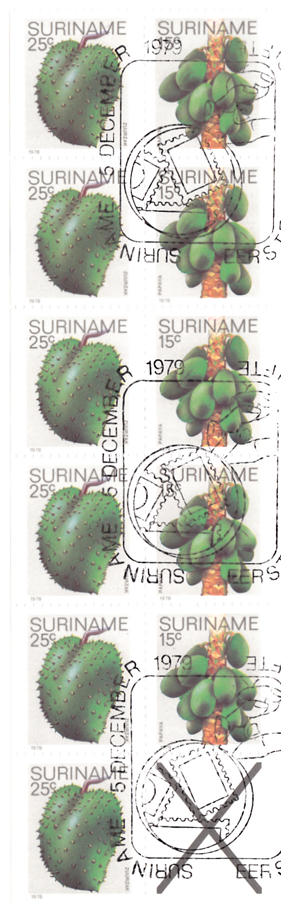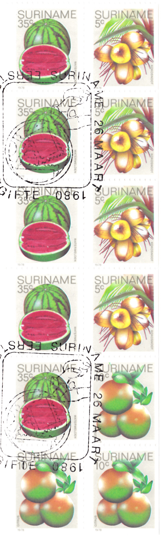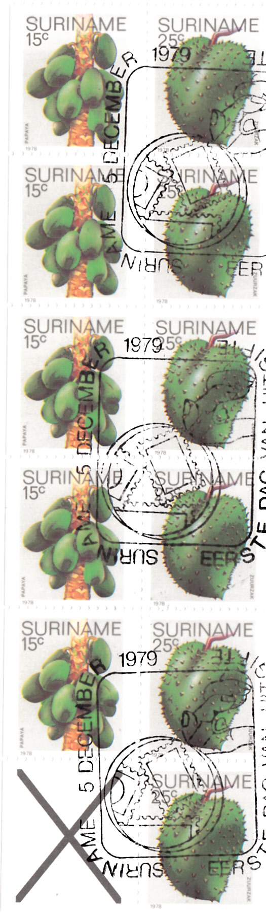 Die auf der vorhergehenden Seite gezeigten Marken aus Surinam gibt es auch bis auf die Marke mit den Bananen teilgezähnt aus Markenheftchen.