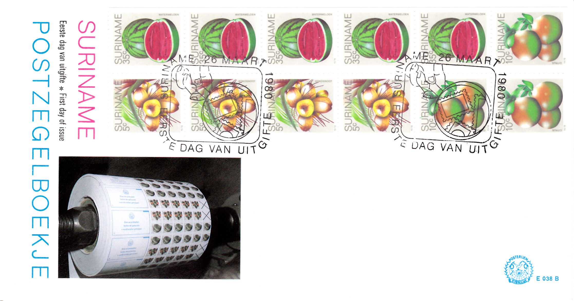 Dieses Heftchenblatt (MiNr H-Bl. 9) beinhaltet die Marken mit der Kokosnuss (4 x 838 Dl), der Apfelsine (1 x 839 Dl, 1 x 839 Elu 1 x 839 Eru) und der Wassermelone (5 x 843 Dr).