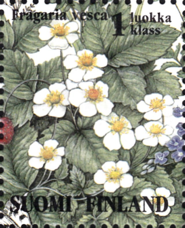 Nachdem hier bereits Früchte der Wald-Erdbeere (Fragaria vesca) auf einer Matrke gezeigt wurde, folgt jetzt eine Marke aus Finnland (MiNr 1261) mit blühenden Wald-Erdbeeren.