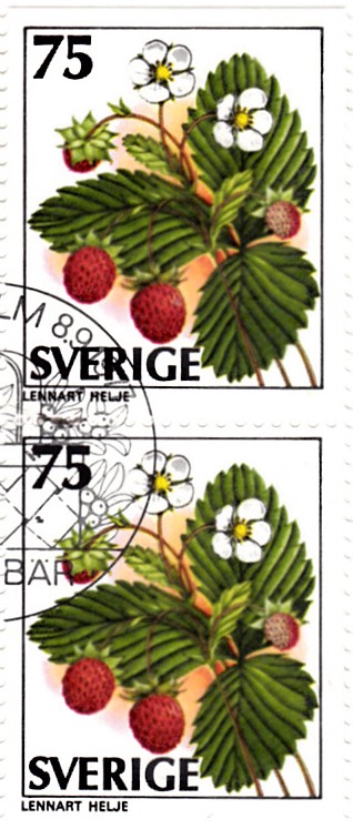 In dieser Serie "Wilde Beeren" aus Schweden gibt es auch noch eine fünfte Marke (MiNr 998), die Walderdbeeren (Fragaria vesca) zeigt. Auch hier zeige ich ein senkrechtes Paar (MiNr 998 Do)998 Du) der Marke.