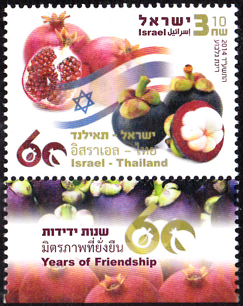 Diese Marke aus Israel (MiNr 2419) vom 5. Juni 2014 zum Thema "60 Jahre diplomatische Beziehungen mit Thailand" zeigt links oben den Granatapfel und rechts unten Mangostanen als typische Obstarten der beiden Länder.