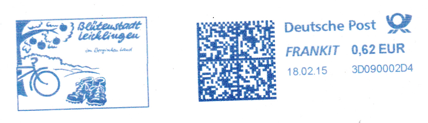 Freistempel der Stadt Leichlingen vom 18.02.2015. Im Werbeeinsatz ist ein Apfelbaum mit Früchten zu sehen.