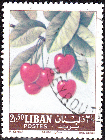 Auf dieser Marke aus dem Libanon (MiNr 799) sehen wir die Abbildung von Süßkirschen (Prunus avium) an einem Kirschbaumzweig. Dieses Markenbild ziert auch noch zwei andere Werte aus der Freimarkenserie vom Dezember 1962 (MiNr 797 Wert zu 0,50 Pia und MiNr 801 Wert zu 7.50 Pia).