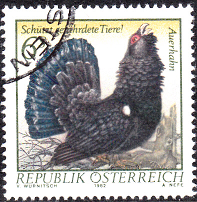 Einen Balzenden Auerhahn (Tetrao urogallus) zeigt diese Marke aus Österreich (MiNr 1062).