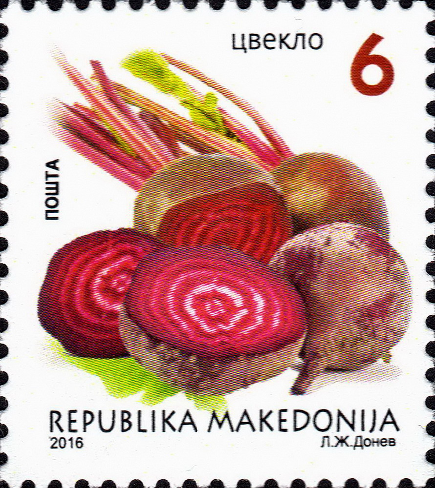 Auf dieser Marke (MiNr 784) aus Makedonien (Nordmazedonien) wird Spinat (Spinacia oleracea) gezeigt.