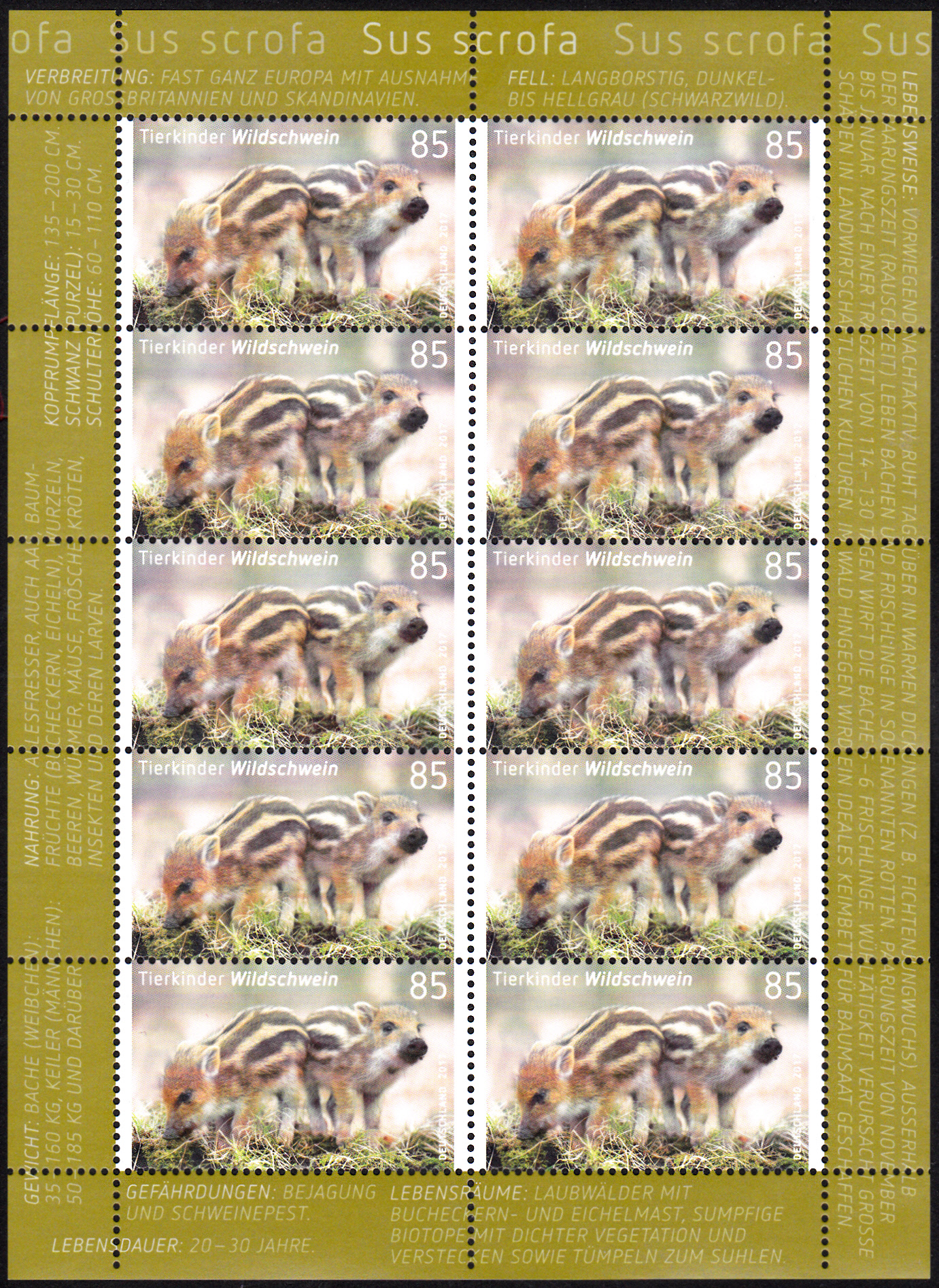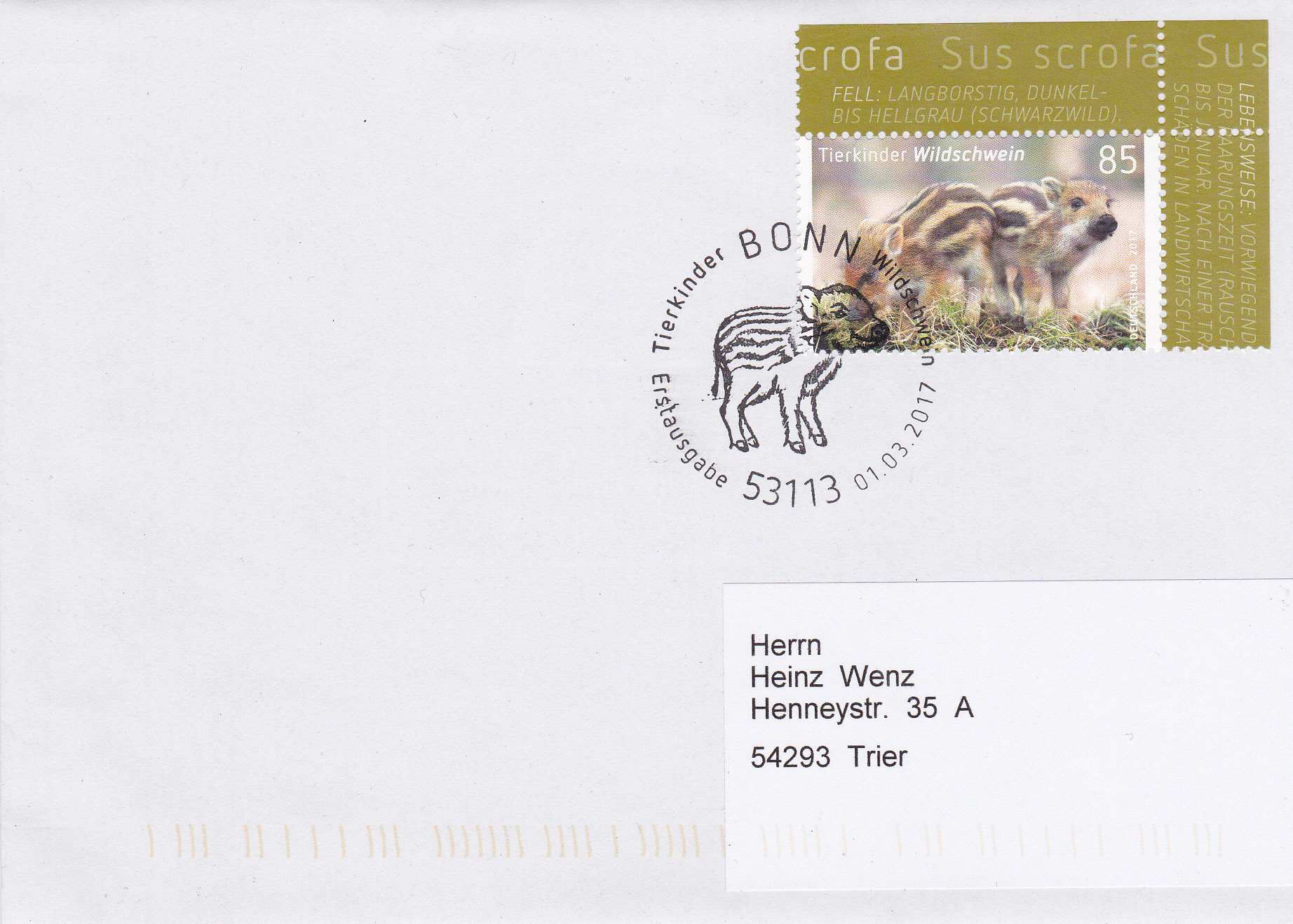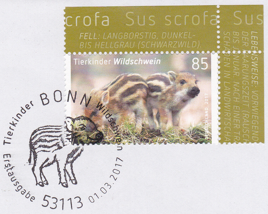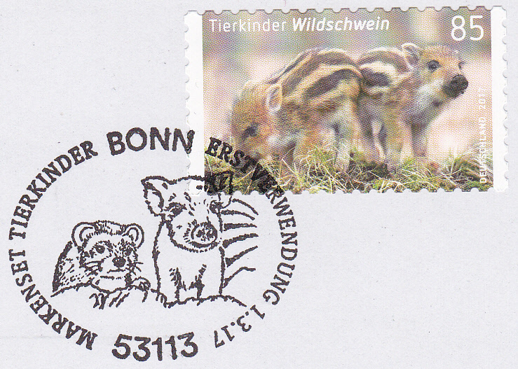 Für die selbstklebende Marke (MiNr 3293) gab es auch wieder einen Erstverwendungsstempel, der im Stempelbild je ein Iltiskind und ein Wildschweinkind zeigt.