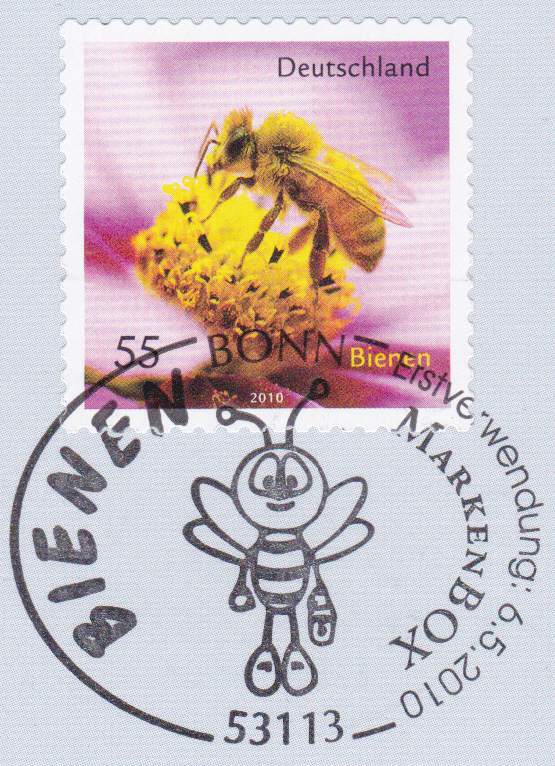 Die bereits zu Beginn hier gezeigte Marke der Deutschen Post AG (MiNr 2798) vom 6.5.2010 mit einer Biene auf einer Blüte gibt es auch als selbstklebende Marke (MiNr 2799) aus Markenheftchen und Folienstreifen aus Rollen. Hier eine Einzelmarke aus der Rolle.