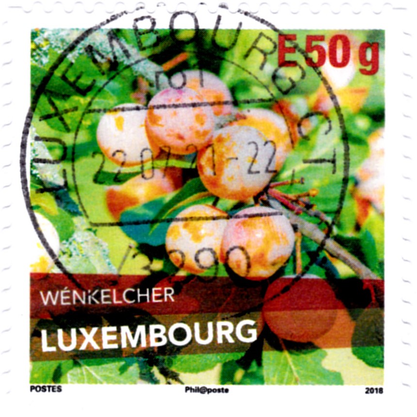 In einer Serie aus Luxemburg werden verschiedene Pflaumenarten gezeigt. Auf dieser Marke (MiNr 2188) sehen wir eine Pflaume mit dem Namen "Wénkelcher". Dies ist eine kleine, gelbliche Pflaume, die zum Branntweinbrennen verwendet wird.