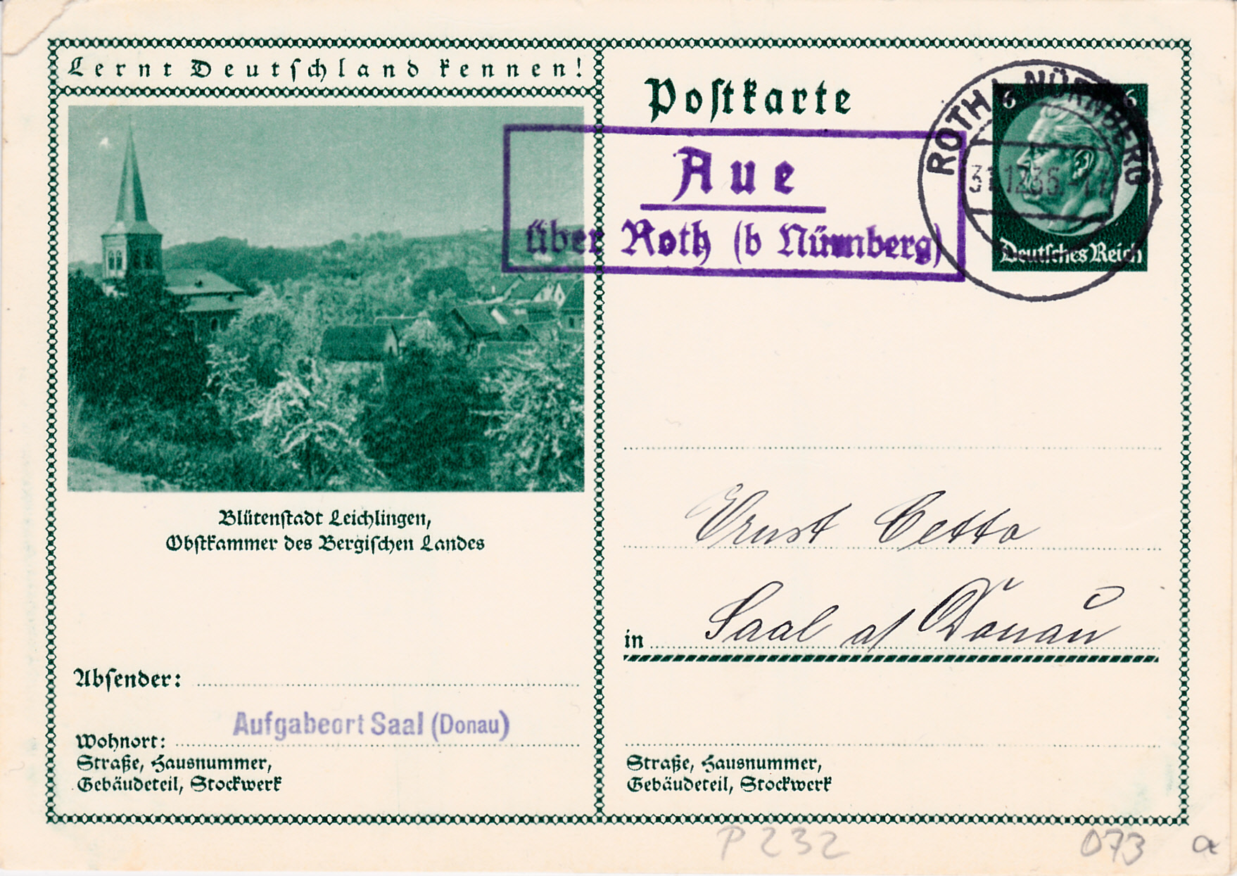 Mit einem Foto auf dieser Bildpostkarte aus dem Jahre 1934 (MiNr P 2332/73) mit blühenden Obstbäumen macht die Stadt Leichlingen auf sich aufmerksam.