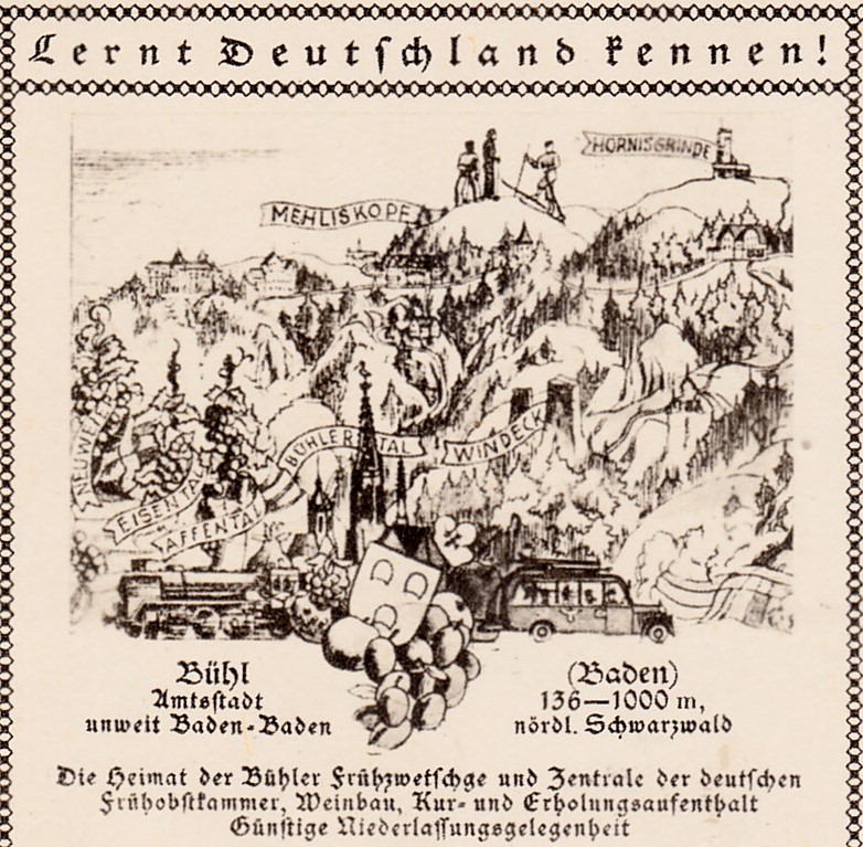 Auf der Zeichnung dieser Bildpostkarte 1936 (Serie 72 Bild 5) wird uns die Heimat der "Bühler Frühzwetschge" vorgestellt.