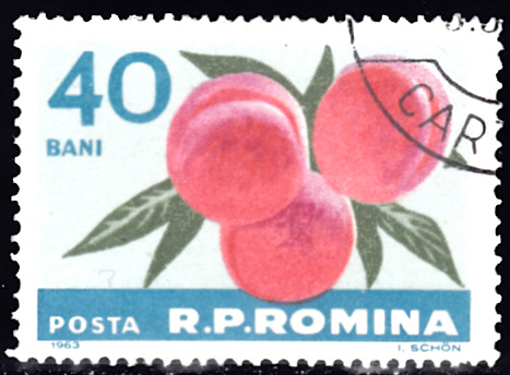 Auf dieser Marke aus Rumänien (MiNr 2178) werden Pfirsiche (Prunus persica) an einem Zweig gezeigt.
