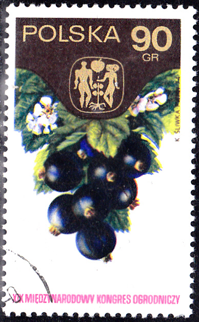 Eine Marke der gleichen Serie aus Polen (MiNr 2330) zeigt Schwarze Johannisbeere (Ribes nigrum).