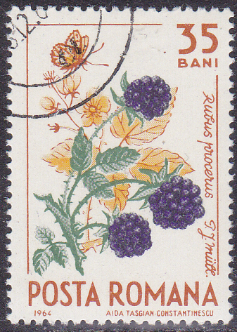 Eine weitere Marke (MiNr 2362) aus der gleichen Serie "Waldfrüchte" aus Rumänien zeigt Brombeeren (Rubus caesius).