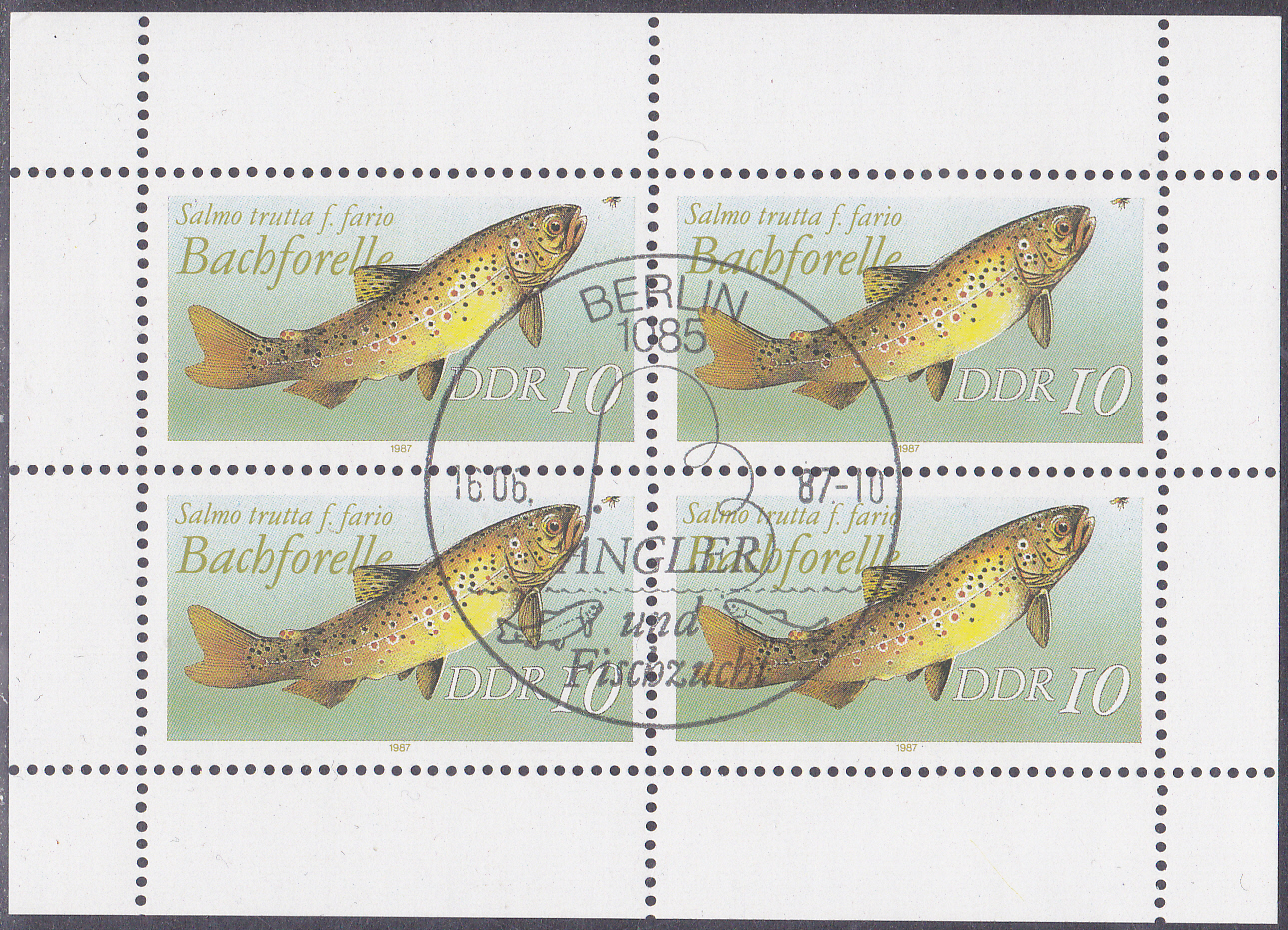 Diese Marke aus der DDR (MiNr 3095) zeigt eine Bachforelle (Salmo trutta fario).